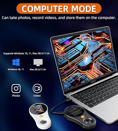 Computer observation mode: Connect the computer through a Type-C cable, then open the built-in camera software on the computer to use, with a large screen for more intuitive viewing. Can take photos, record videos, and store them on the computer. Supports Windows 10, 11, Mac OS X/11.0+. TIP: Note that in computer usage mode, the product buttons cannot be used, which is a normal phenomenon.